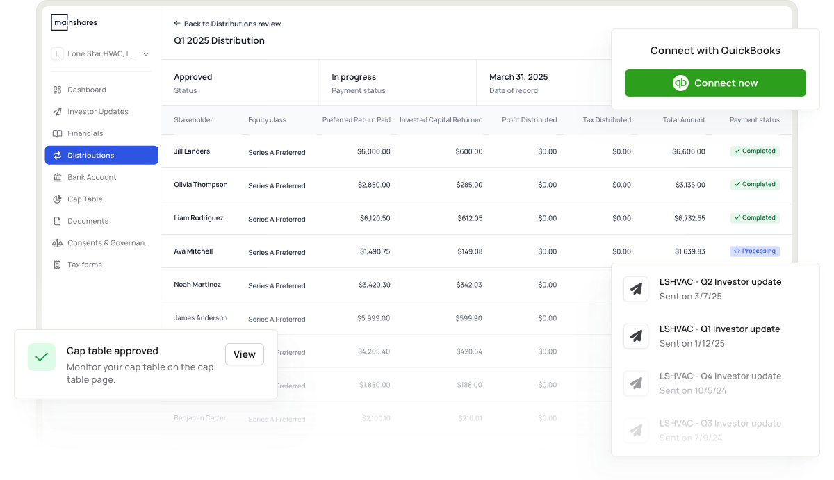 Use Mainshares to centralize your cap table, automate and verify distributions, and send out investor communications — so you can focus on building your business.
